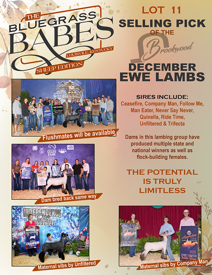 BLUEGRASS BABES Sellin Pick of the December Ewe Lambs! Fall Born Sale – Dec. 9 On SC Online Sales Large number of competitive ET and AI wethers available.Various ages available.